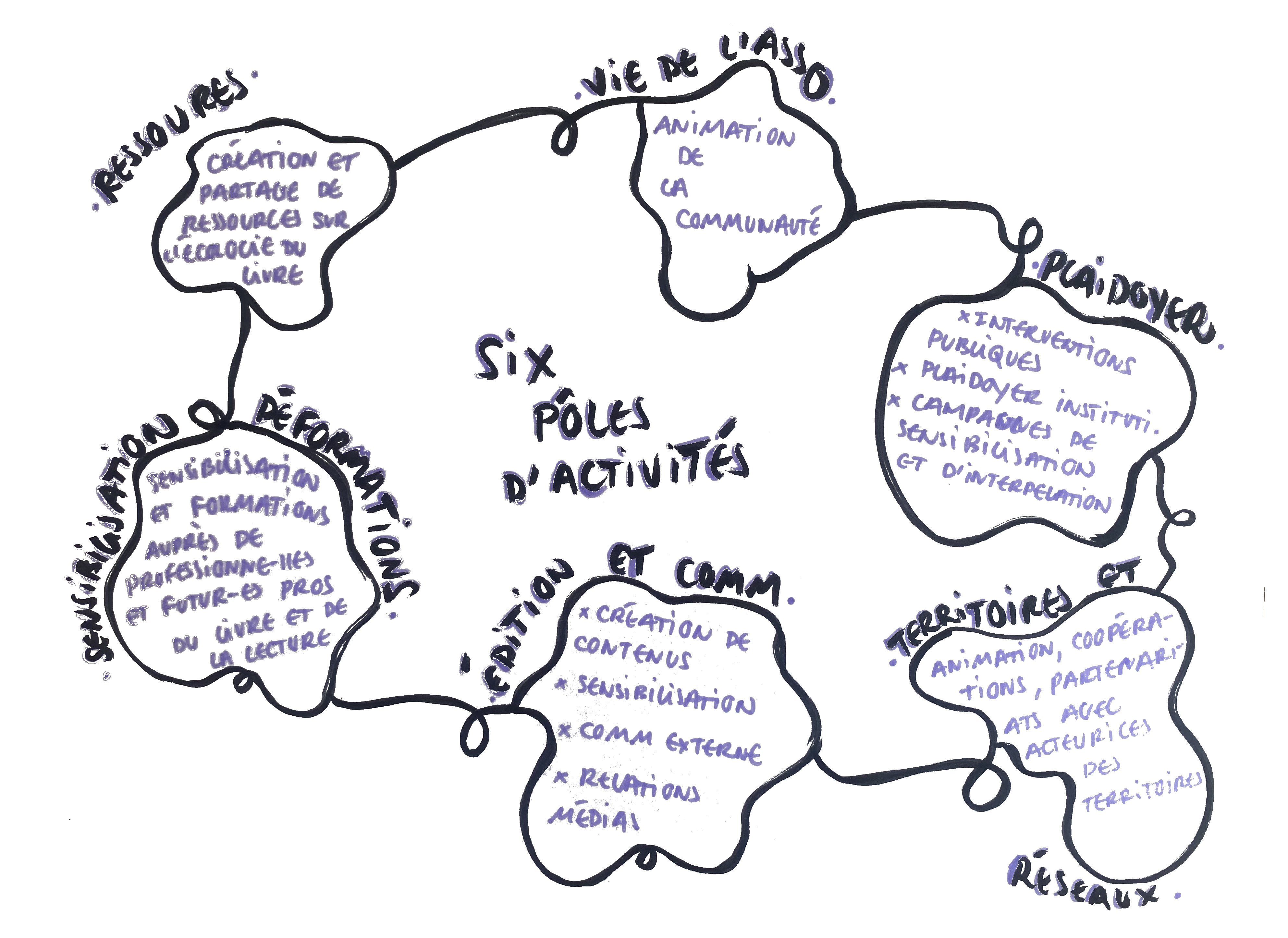 L’association est organisée en six pôles d’activités : vie de l’association, ressources, plaidoyer, édition & communication, sensibilisation & (dé)formations, territoires & réseaux.
